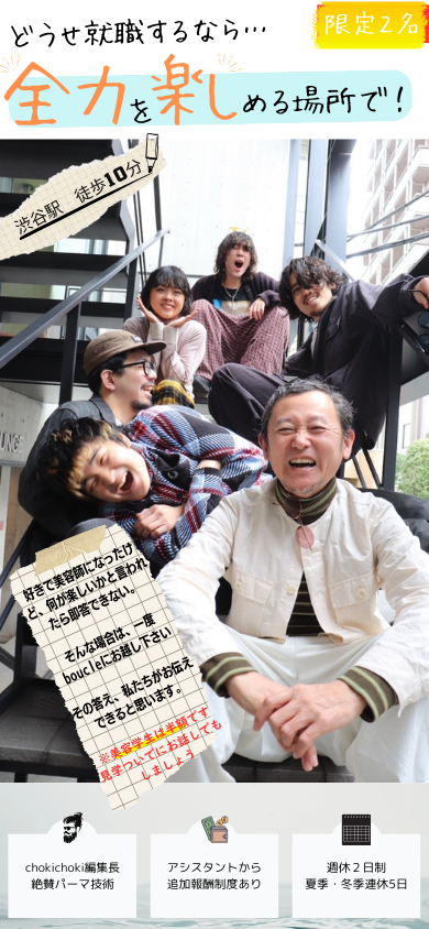 「この感じをわかってくれるのはここしかない」。選ばれた人だけがもらえる、最高の褒め言葉です。工房のような空気感の中で、パーマ技術とクラフトマンシップを学びたい人には最適なサロンだと思います。「どこにでもいそうな美容師になりたくない」「絶対的に自信が持てる武器が欲しい」そんなマインドにピンときたら、boucleのドアをノックしてみよう。