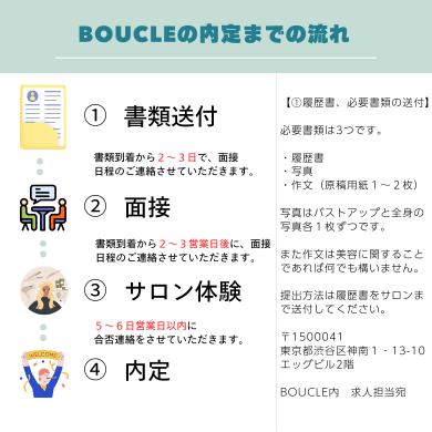 送っていただいた履歴書などを元にboucleサロン内で面接をいたします。